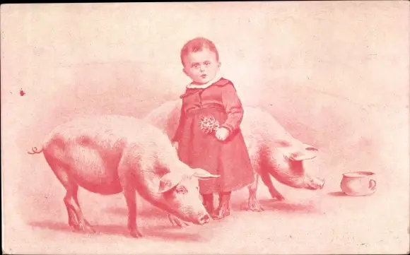 Ak Kind mit zwei Schweinen, Nachttopf