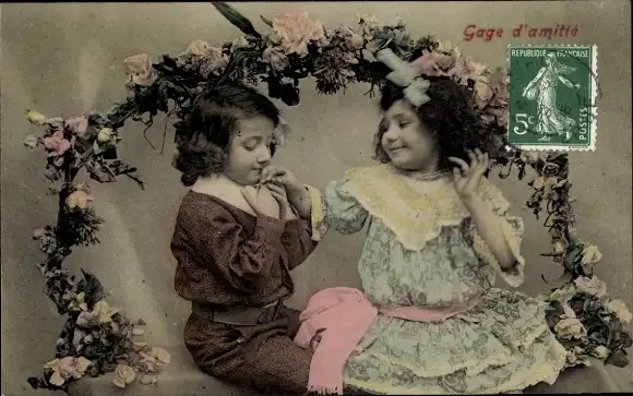 Ak Kinder, Liebespaar, Kuss, Blumen