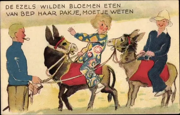 Ak Kinder auf Esel reitend, Mann mit Pfeife