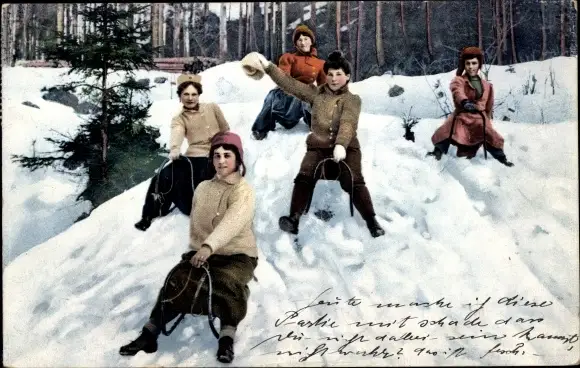 Ak Kinder auf Schlitten, Rodelbahn, Waldpartie