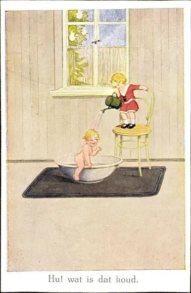 Ak Kinder beim Waschen, Waschwanne, Gießkanne, Kitsch