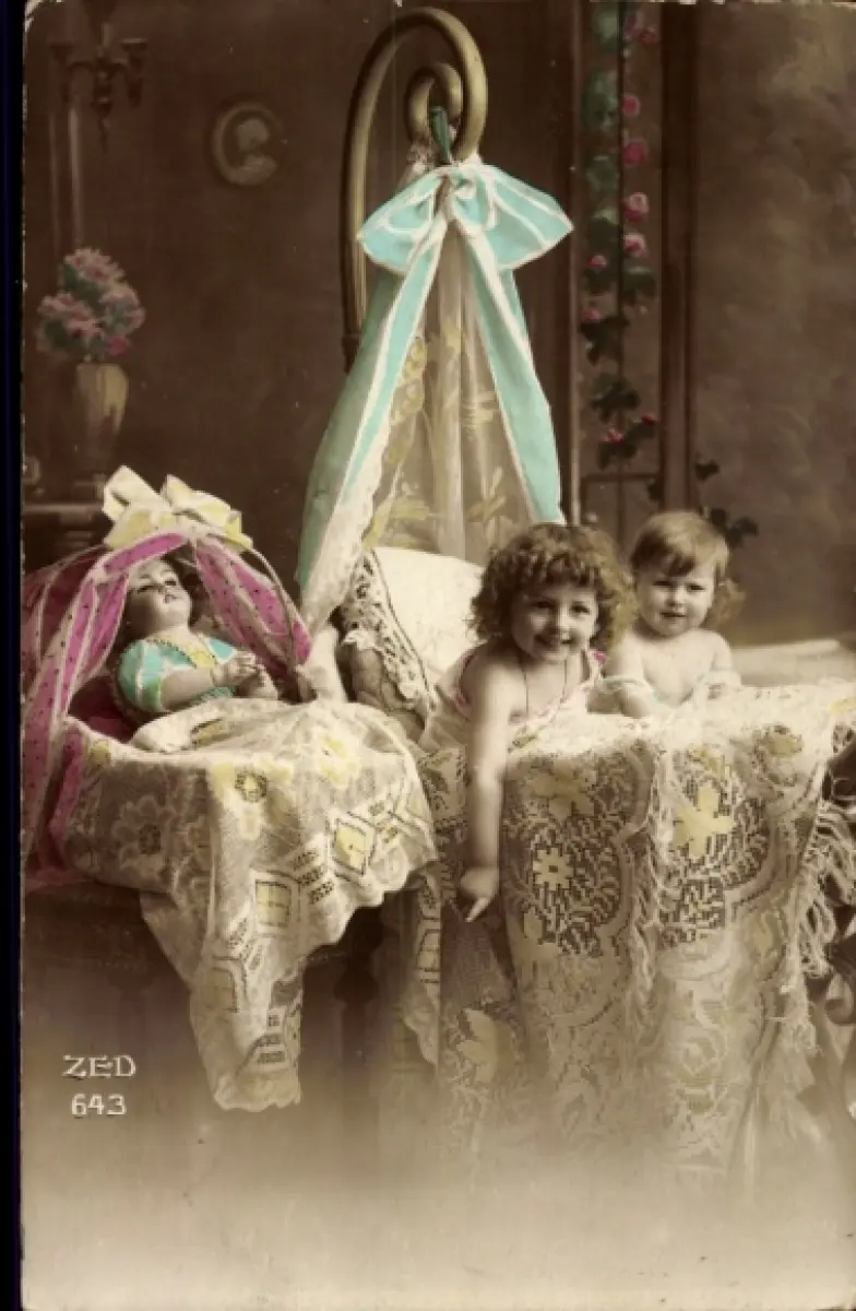 Ak Kinder im Bett, Puppe