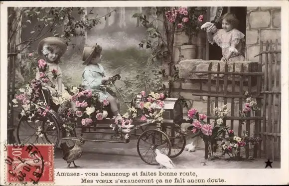 Ak Kinder in einem mit Blumen geschmückten Automobil
