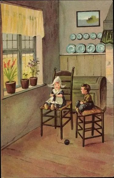 Ak Kinder in niederländischen Trachten, Stricken