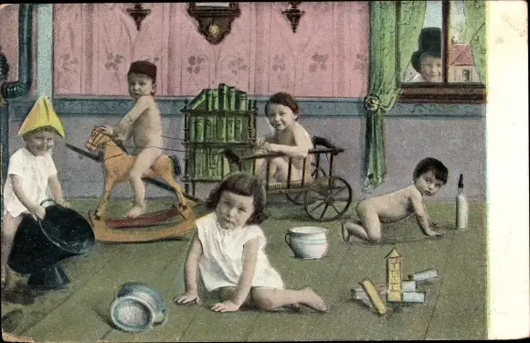 Ak Kinder mit Spielzeugen, Schaukelpferd, Nachttopf