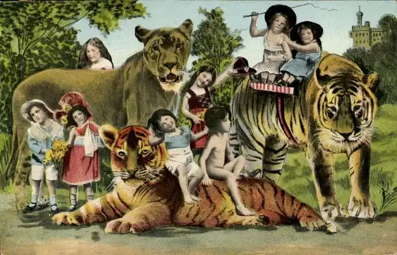 Ak Kinder mit Tieren, Löwe, Tiger, Fotomontage
