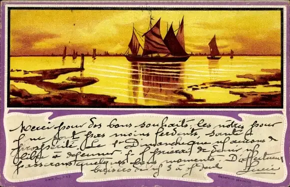 Ak Kitsch, Segelpartie, Segelboote, Abendstimmung