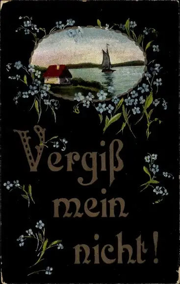 Ak Kitsch, Vergissmeinnicht, Segelboot, Haus