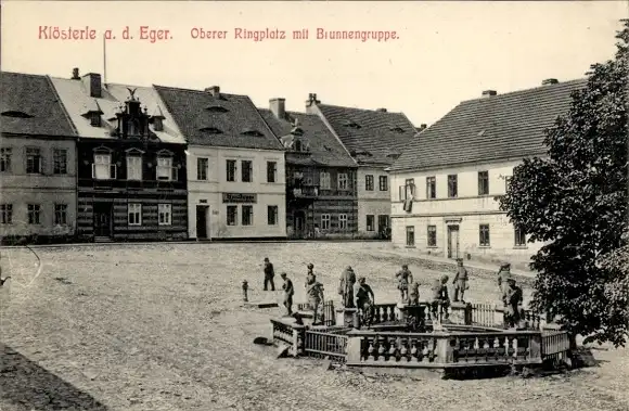 Ak Klášterec nad Ohří Klösterle an der Eger Region Aussig, Oberer Ringplatz, Brunnengruppe