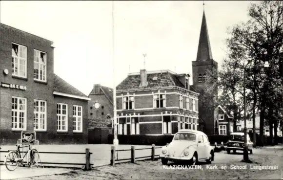 Ak Klazienaveen Drenthe, Kirche, Schule, Langestraat, VW Käfer, Reklame Persil