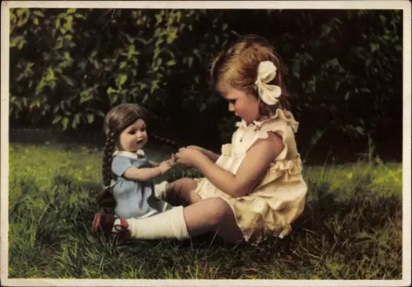 Ak Kleines Mädchen sitzt mit ihrer Puppe auf einer Wiese