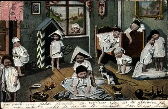Ak Kleinkinder, Zimmer, Bett, Hund, Nachttopf, Toilettenhumor