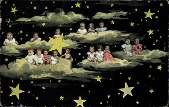 Ak Kleinkinder auf Wolken, Sterne, Fotomontage