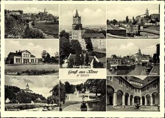 Ak Kleve am Niederrhein, Teilansichten, Bahnhof, Amphitheater, Schwanenburg, Hafen