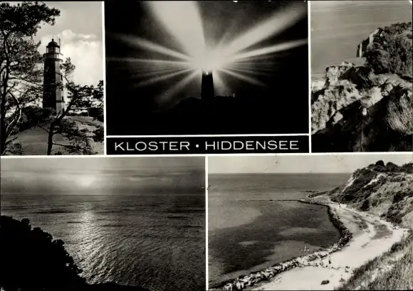 Ak Kloster Insel Hiddensee in der Ostsee, Teilansichten, Strand, Klippen, Leuchtturm