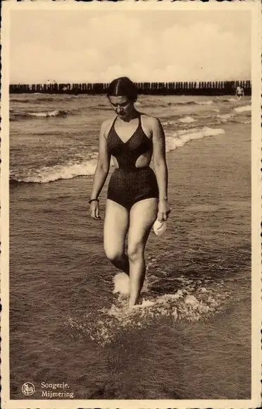 Ak Knocke-Zoute, Strand, Frau im Badeanzug, Bademode