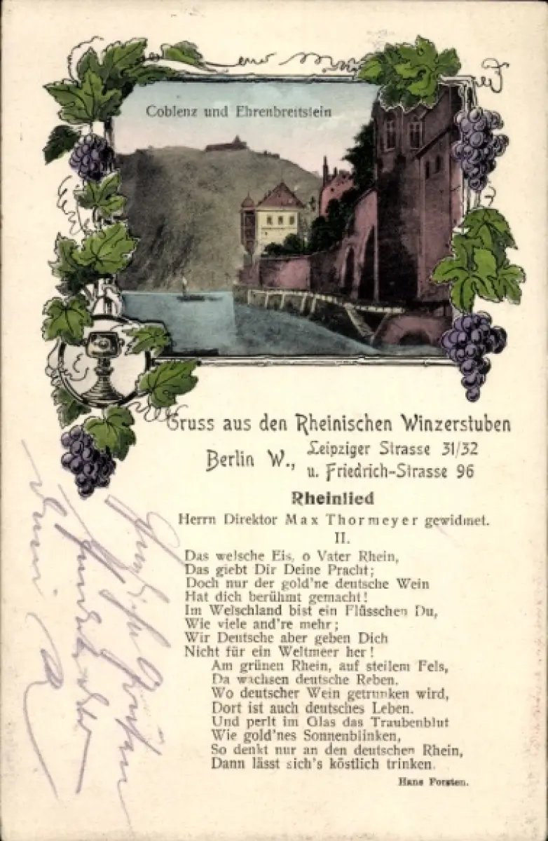 Ak Koblenz am Rhein, Ehrenbreitstein, Rheinlied, Rheinische Winzerstuben Berlin