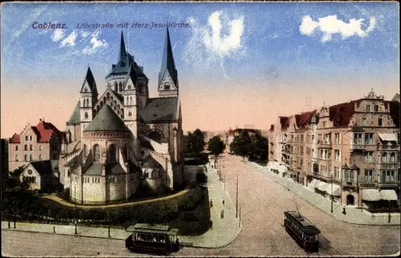 Ak Koblenz am Rhein, Löhrstraße, Herz Jesu Kirche, Straßenbahnen