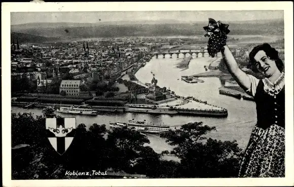 Ak Koblenz am Rhein, Totalansicht, Wappen, Frau mit Weintrauben