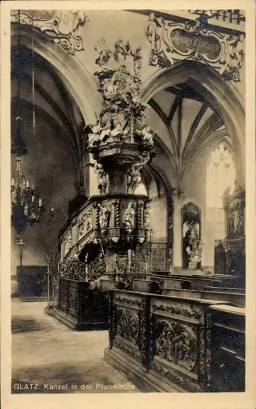 Ak Kłodzko Glatz Schlesien, Kanzel, Pfarrkirche, Innenansicht, Architektur
