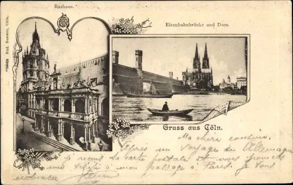 Ak Köln am Rhein, Eisenbahnbrücke, Dom, Rathaus, Boote
