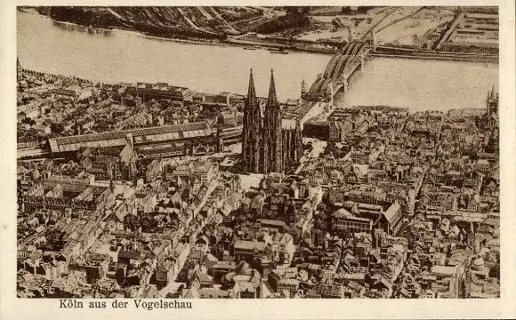 Ak Köln am Rhein, Luftaufnahme, Dom, Bahnhof, Rhein, Hohenzollernbrücke, Stadtansicht