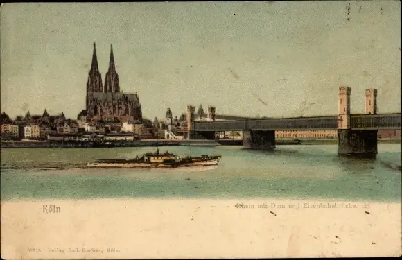 Ak Köln am Rhein, Rhein mit Dom und Eisenbahnbrücke, Schiff