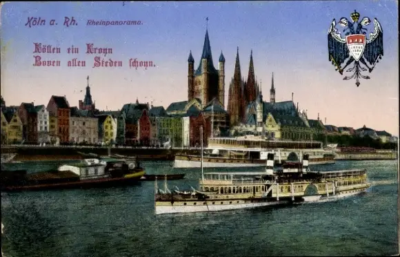 Ak Köln am Rhein, Rheinpanorama, Dampfer, Dom, Wappen