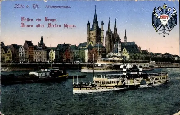 Ak Köln am Rhein, Rheinpanorama, Schiffe, Dom, Gedicht, Wappen