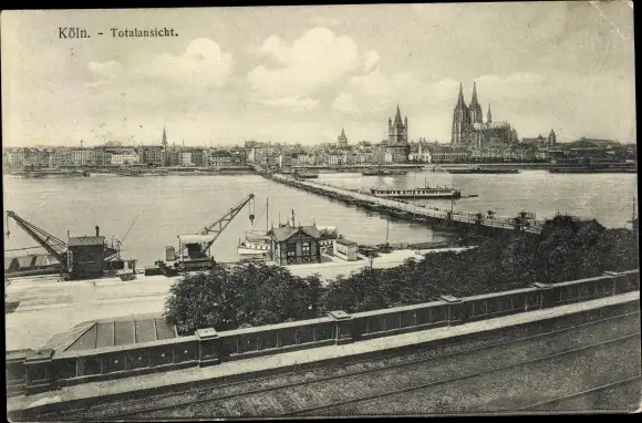 Ak Köln am Rhein, Totalansicht, Dom, Brücke, Kräne