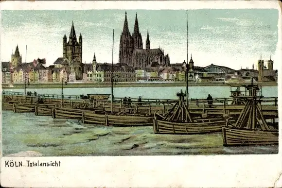 Ak Köln am Rhein, Totalansicht, Schiffbrücke, Dom