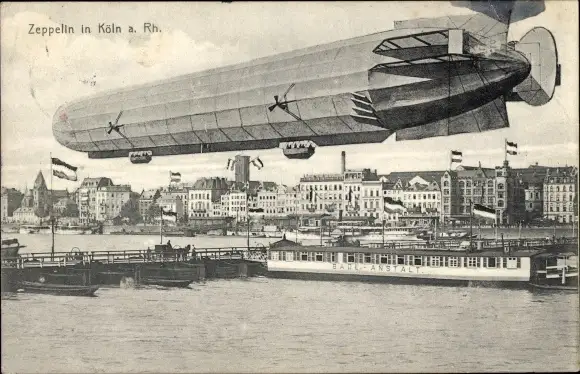Ak Köln am Rhein, Zeppelin, Badeanstalt, Schiffbrücke, Teilansicht der Stadt