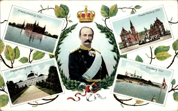Ak König Frederik VIII von Dänemark, Schlösser, Frederiksborg, Kronborg, Fredensborg