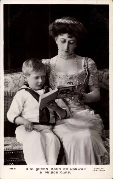 Ak Königin Maud von Norwegen mit Prinz Olav