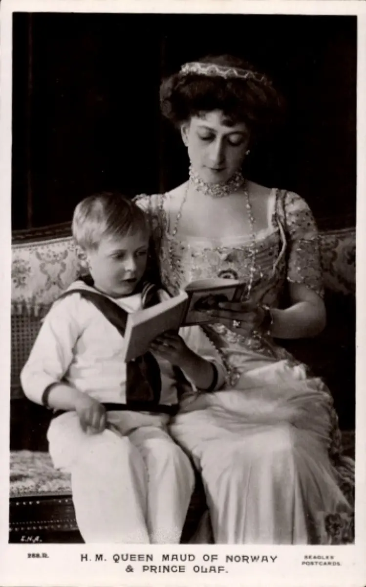 Ak Königin Maud von Norwegen mit Prinz Olav