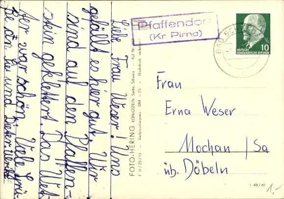 Zustand, siehe Scan, gelaufen- Landpoststempel Pfaffendorf Kr. Pirna - ca 5 cm X 3 cm