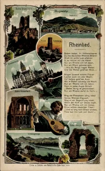 Ak Königswinter am Rhein, Rheinlied, Ruine Drachenfels, Ruine Heisterbach, Rolandsbogen
