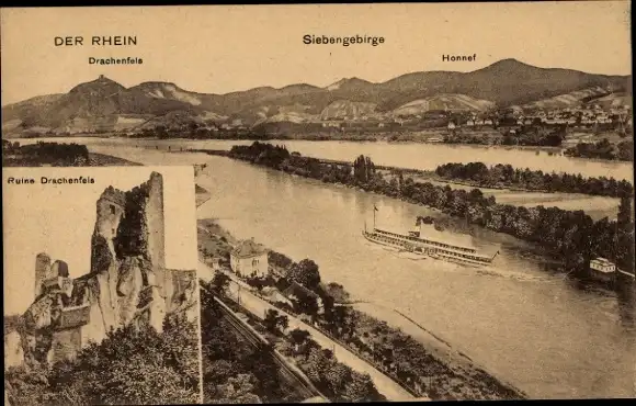 Ak Königswinter am Rhein, Ruine Drachenfels, Honnef, Siebengebirge, Dampfer