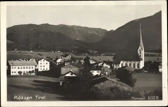 Ak Kössen Tirol, Blick auf den Ort, Kirche, Berge