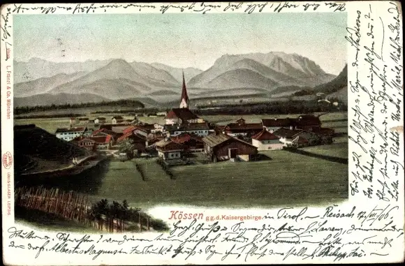 Ak Kössen in Tirol, gg. d. Kaisergebirge, Panorama mit Kirchturm