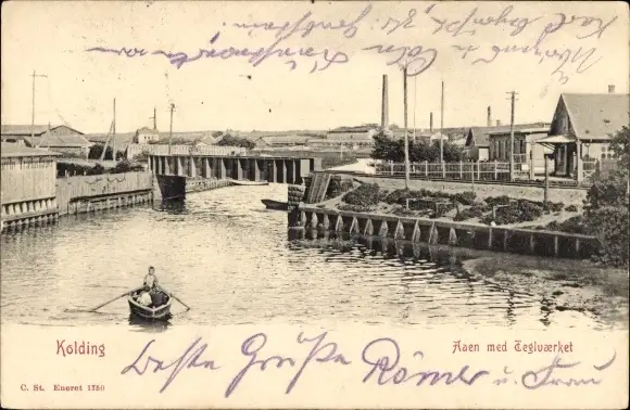 Ak Kolding Dänemark, Flusspartie mit Ziegelei