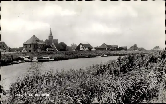 Ak Kolhorn Nordholland Niederlande, Flusspartie, Wohnhäuser, Boot