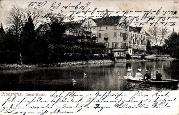 Ak Konstanz am Bodensee, Blick vom Wasser auf das Insel Hotel, Ruderboot