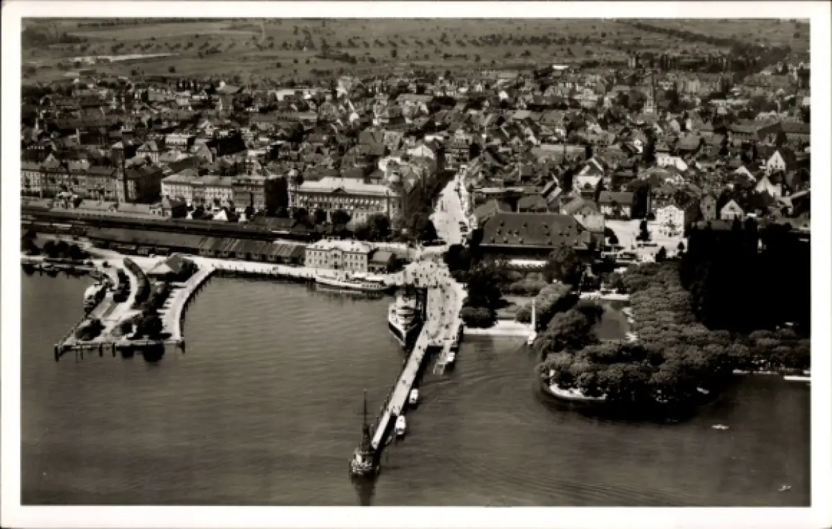 Ak Konstanz am Bodensee, Luftaufnahme von Konstanz, Stadtansicht, Bodenseeufer, Hafen, Schiffe
