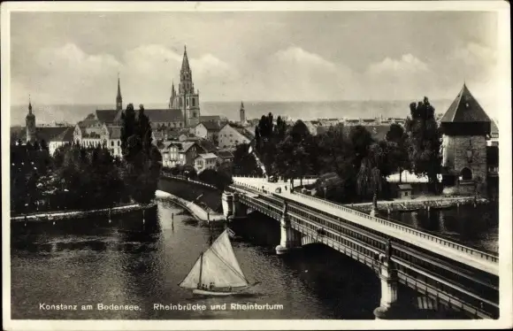 Ak Konstanz am Bodensee, Rheinbrücke und Rheintorturm, Segelboot