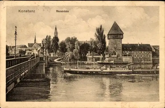 Ak Konstanz am Bodensee, Teilansicht, Rheinbrücke, Schiff, Turm