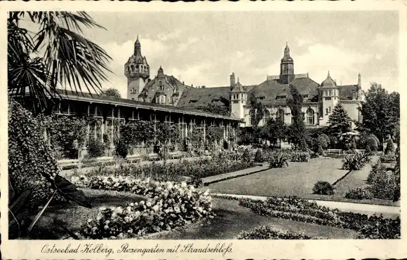 Ak Kołobrzeg Ostseebad Kolberg Pommern, Rosengarten, Strandschloss