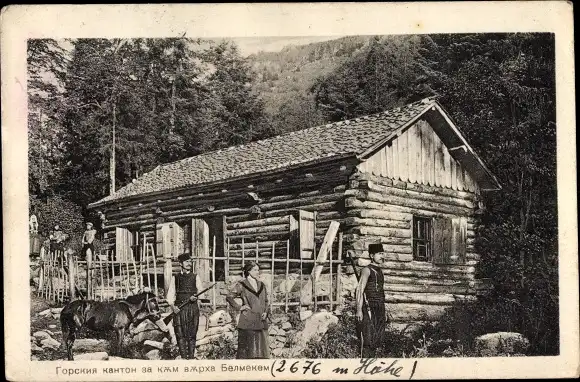 Ak Kostenez Bulgarien, Personen vor einer Blockhütte