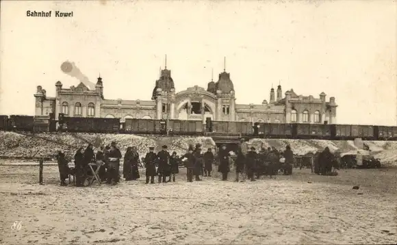 Ak Kowel Ukraine, Bahnhof , Schnee, Personen in r Kleidung, Züge