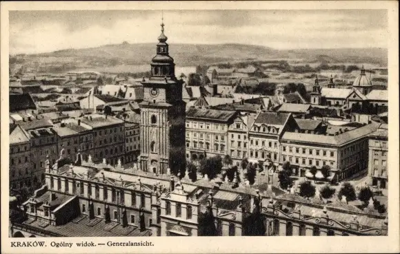 Ak Kraków Krakau Polen, Gesamtansicht, Glockenturm, Tuchhallen